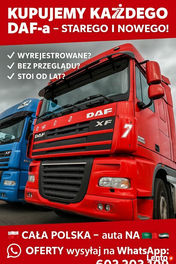 Skup Ciezarowek Scania Skup# Daf kupię # Man Skup# man kupię #Volvo# Skup Mercedes# Stan Obojętny Bez OC/ Przeglądu Wyrejestrowane na Export 0d 1970r do 2017r www.77skupautciezarowych.pl . Oferty Proszę przesyłać na tel 500 - pokaż numer telefonu -Sprawdź zainteresowanie tym ogłoszeniem